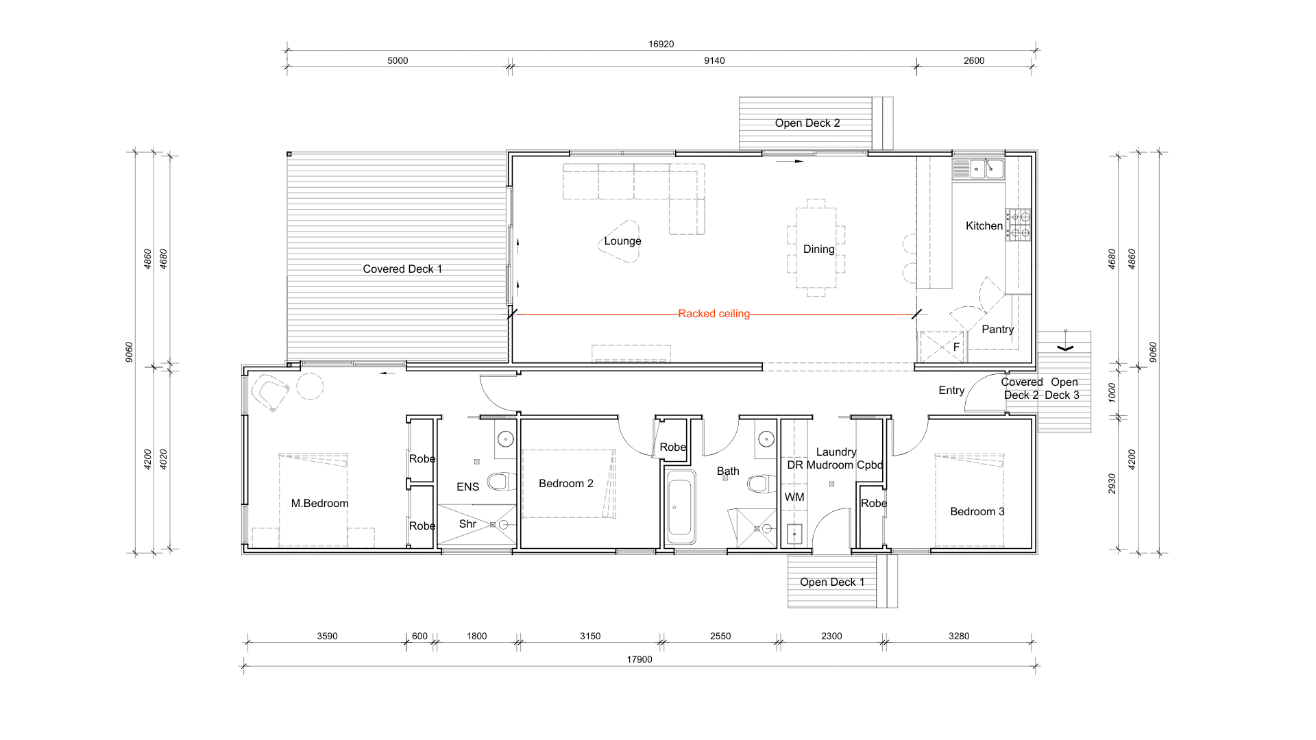 A spacious three bedroom home with a generous open plan living area at its centre. The kitchen, dining, and lounge flow seamlessly together under a raked ceiling, creating a light filled and welcoming space that connects directly to outdoor entertaining areas. The master suite is privately positioned with ensuite, while additional bedrooms are located in a separate wing with access to a central bathroom and laundry, making it a practical and comfortable home for modern family living.