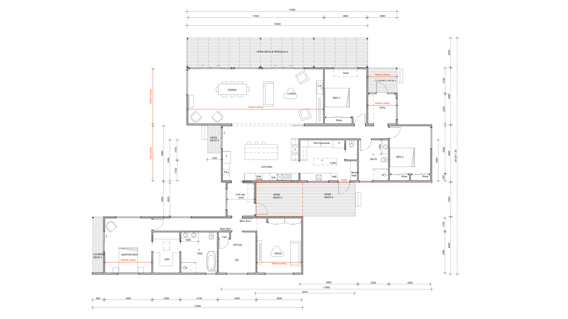 A thoughtfully designed three-module custom home that creates clear separation between living, sleeping, and retreat spaces. The main living pavilion features open-plan dining and living with raked ceilings and a strong connection to outdoor entertaining areas. A central kitchen and service module links the home together, while the private master wing includes a walk-in robe, ensuite, office, and snug, creating a true retreat. With multiple living zones and a considered layout, this home is ideal for modern family living with both connection and privacy.